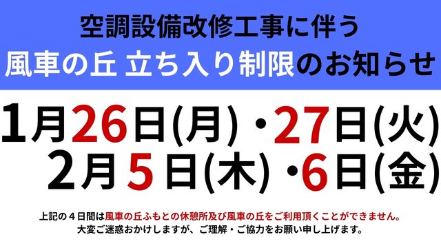 空調設備改修工事に伴う一部施設休館及び風車の丘への立ち入り制限のお知らせ(1月24日追記)