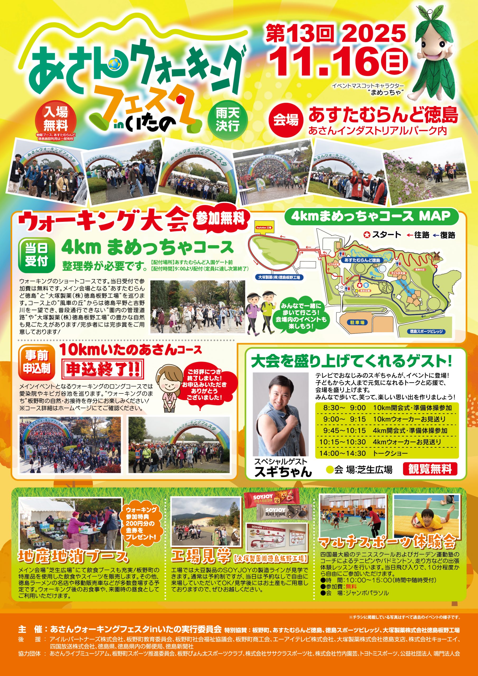 「環境と健康を考える」をテーマに、ウォーキング大会、ステージイベント(スギちゃんトークショー、スポーツ体験会など)板野町の特産品を使用した飲食、SOY JOY製造ライン見学など盛り沢山のイベントを開催!