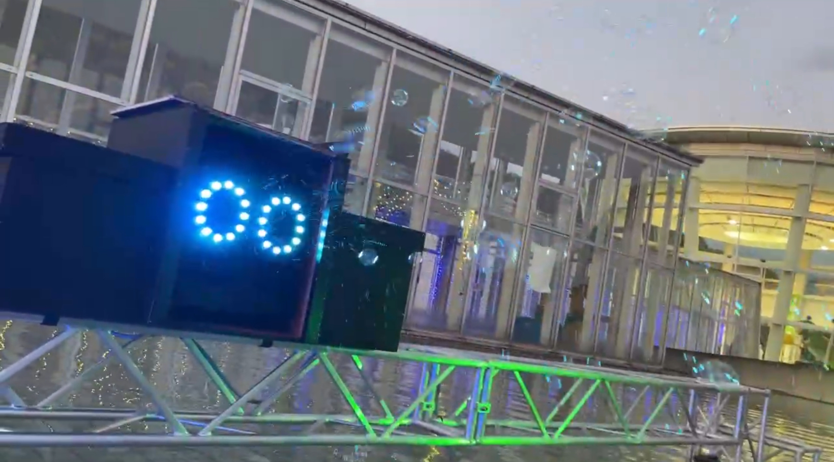水鏡ゴロゴロコースター側の広場で、煙の入ったシャボン玉に光を当て、色がつく仕組みを体感できるよ🫧