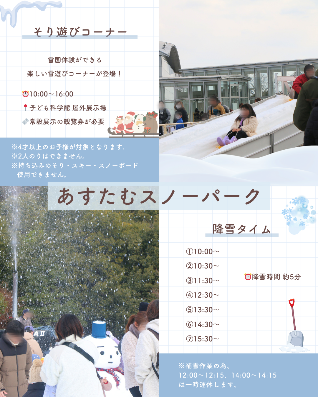 雪国体験ができる楽しい雪遊びコーナーが登場!降雪タイムもあるよ!