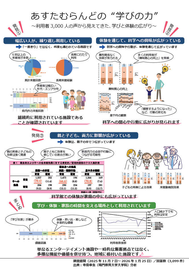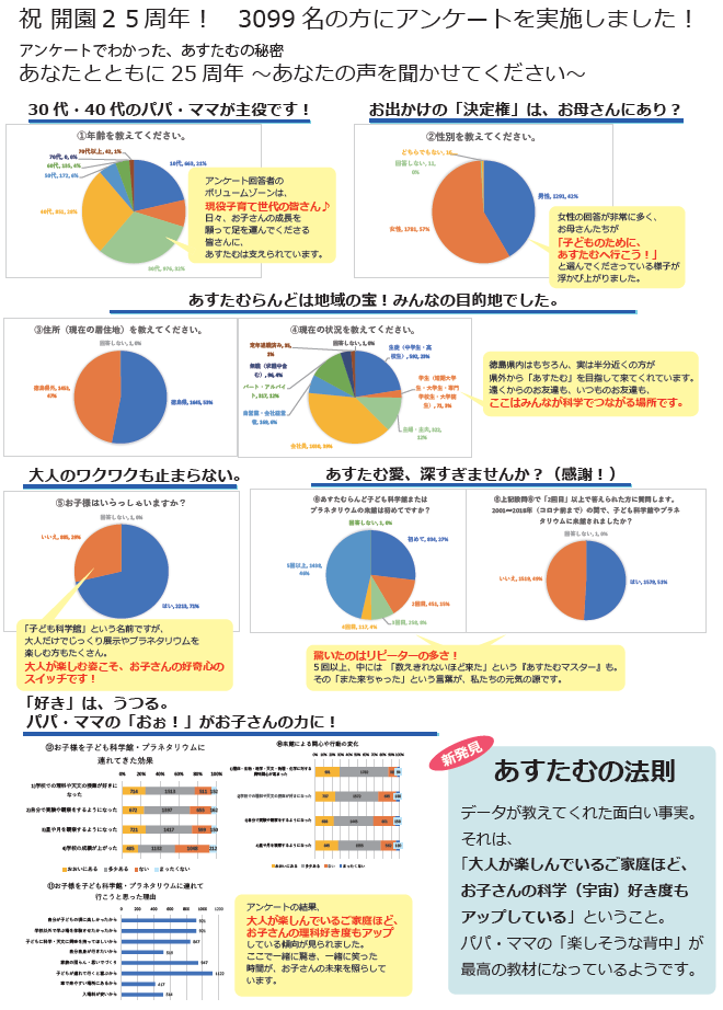 来場された3,099人の方にご参加いただきましたアンケート結果をもとに、人気の展示・イベントランキング、あすたむらんど徳島への要望など、クロス集計も踏まえて、来場者のあすたむらんど徳島での思い出とともに、未来志向型のパネル展示としてわかりやすくご紹介します。